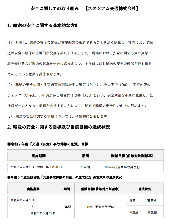 安全に関しての取り組み 【スタジアム交通株式会社】 1. 輸送の安全に関する基本的な方針 (1) 社長は、輸送の安全の確保が事業経営の根幹であることを深く認識し、社内において輸送の安全の確保に主導的な役割を果たします。また、現場における安全に関する声に真摯に耳を傾けるなど現場の状況を十分に踏まえつつ、全社員に対し輸送の安全の確保が最も重要であるという意識を徹底させます。 (2) 輸送の安全に関する交通事故削減計画の策定(Plan)、その実行(Do)、実行内容のチェック(Check)、不備がある場合には改善(Act)を行い、安全対策を不断に見直し、全社員が一丸となって業務を遂行することにより、絶えず輸送の安全性の向上に努めます。 (3) 輸送の安全に関する情報については、積極的に公表します。