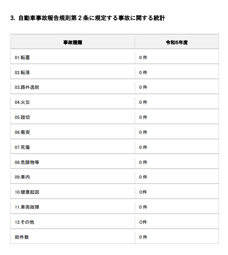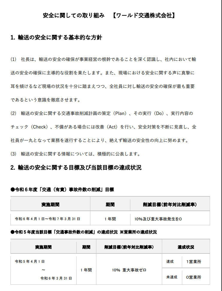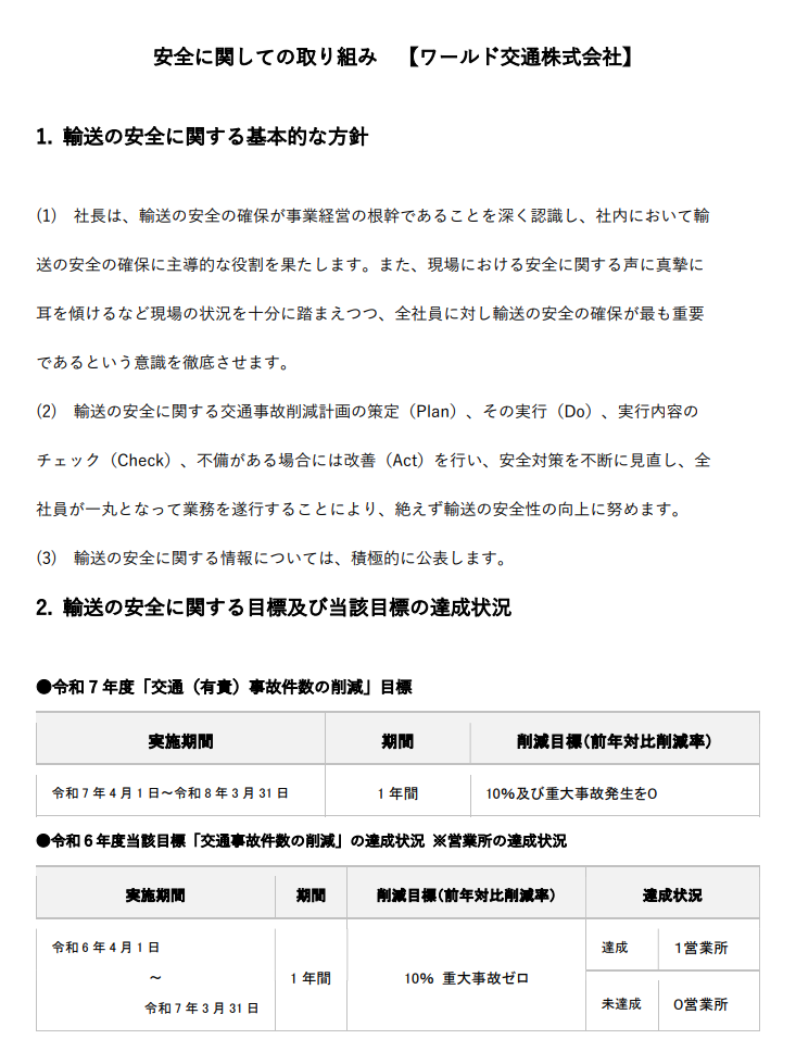 安全に関しての取り組み 【スタジアム交通株式会社】 1. 輸送の安全に関する基本的な方針 (1) 社長は、輸送の安全の確保が事業経営の根幹であることを深く認識し、社内において輸送の安全の確保に主導的な役割を果たします。また、現場における安全に関する声に真摯に耳を傾けるなど現場の状況を十分に踏まえつつ、全社員に対し輸送の安全の確保が最も重要であるという意識を徹底させます。 (2) 輸送の安全に関する交通事故削減計画の策定(Plan)、その実行(Do)、実行内容のチェック(Check)、不備がある場合には改善(Act)を行い、安全対策を不断に見直し、全社員が一丸となって業務を遂行することにより、絶えず輸送の安全性の向上に努めます。 (3) 輸送の安全に関する情報については、積極的に公表します。